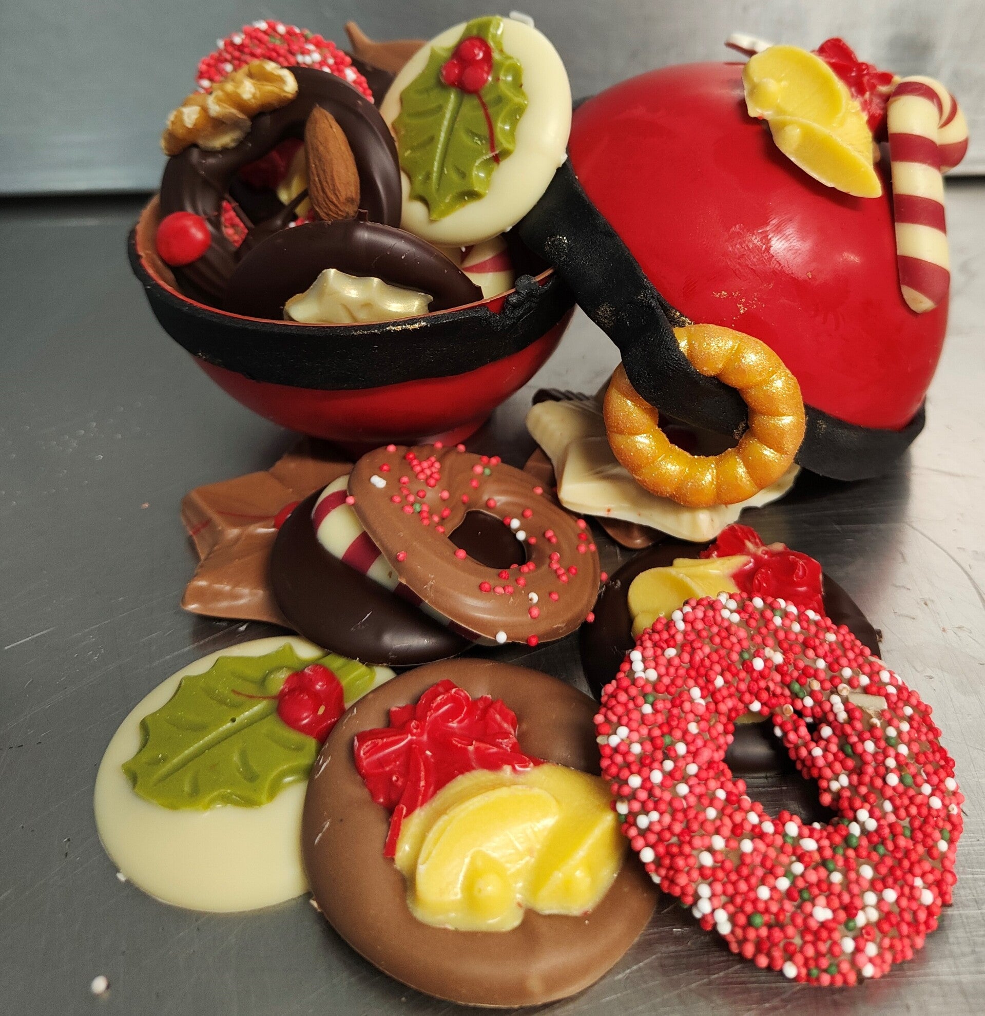 De kerstbelly is gemaakt van chocolade. Hij kan gevuld worden met kerstchocolade of bonbons